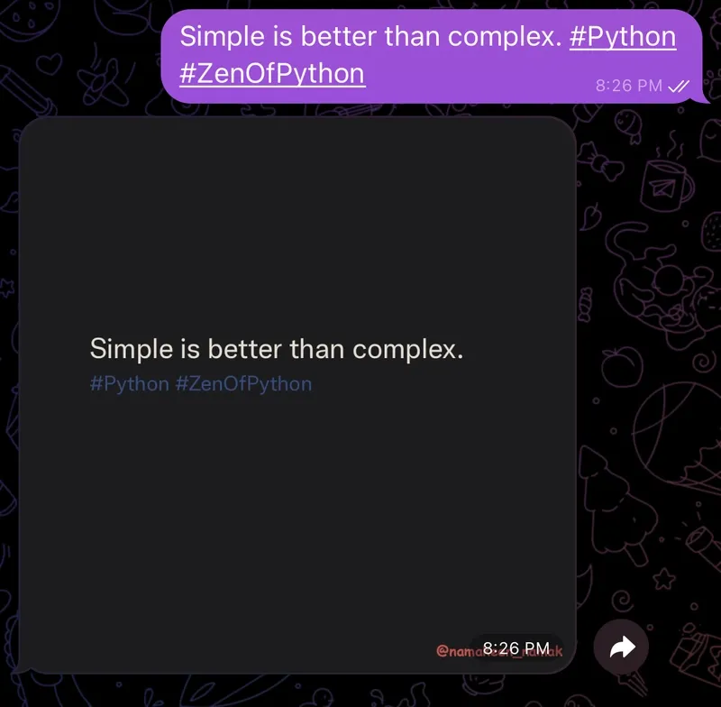 Simple is better than complex. #Python #ZenOfPython - Output: A beautifully formatted image with the text and hashtags